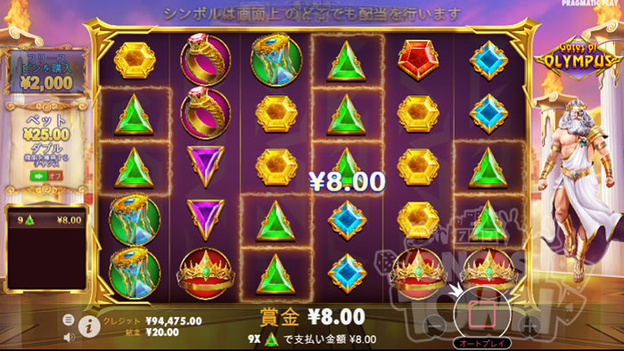 6×5のリール上に、同じシンボルが8つ以上出現すれば当たりです。